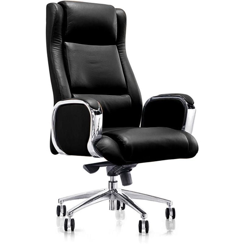 Кресло для руководителя Echair-545 ML с обивкой черного цвета. Лицевые части декорированы натуральной кожей. Боковины, задняя часть сиденья и спинки выполнены из высококачественной искусственной кожи с учетом фактуры кресла. Крестовина изготовлена из хромированного металла. Кресло оборудовано механизмом качания повышенной комфортности Multiblock с возможностью фиксации спинки в пяти положениях. Имеется регулировка по высоте (газлифт). Благодаря использованию усиленного газлифта кресло EChair-545 ML выдерживает статическую нагрузку до 200 кг.