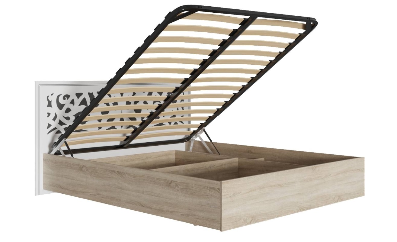 Кровать выполнена под матрац 1,6 х 2,0 м. Допустимая нагрузка на спальное место при условии статичной равномерно распределенной нагрузки до 170 кг. с учётом матраца. Под ортопедическим основание расположен отсек для хранения вещей.