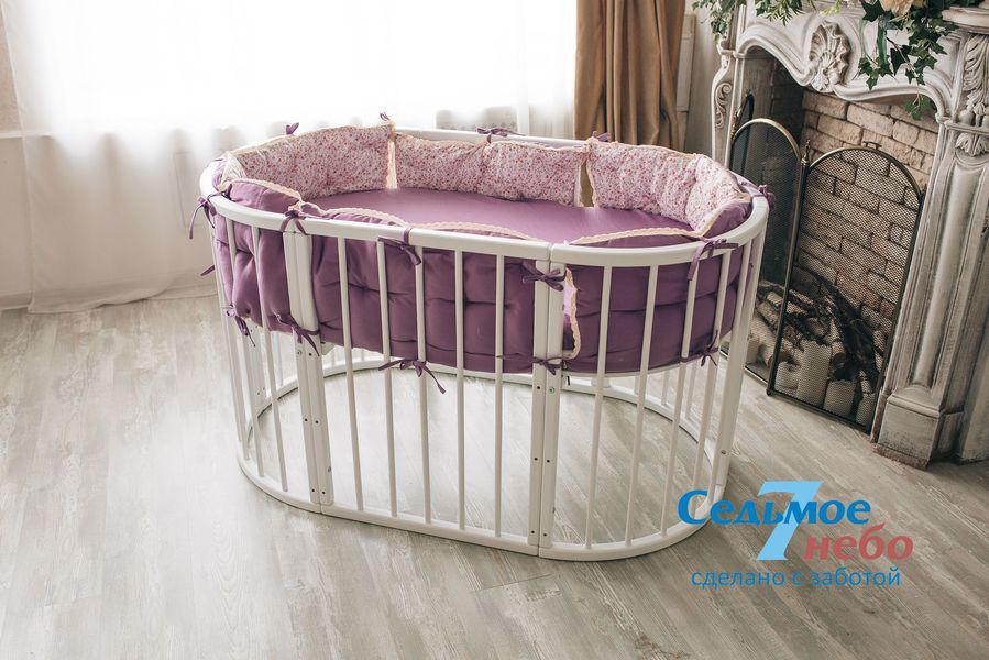 | Особенности | Кроватка-трансформер имеет 6 вариантов трансформации: круглая кроватка (колыбель) и пеленальный столик; овальная кроватка; диванчик; манеж; столик и два стульчика. |