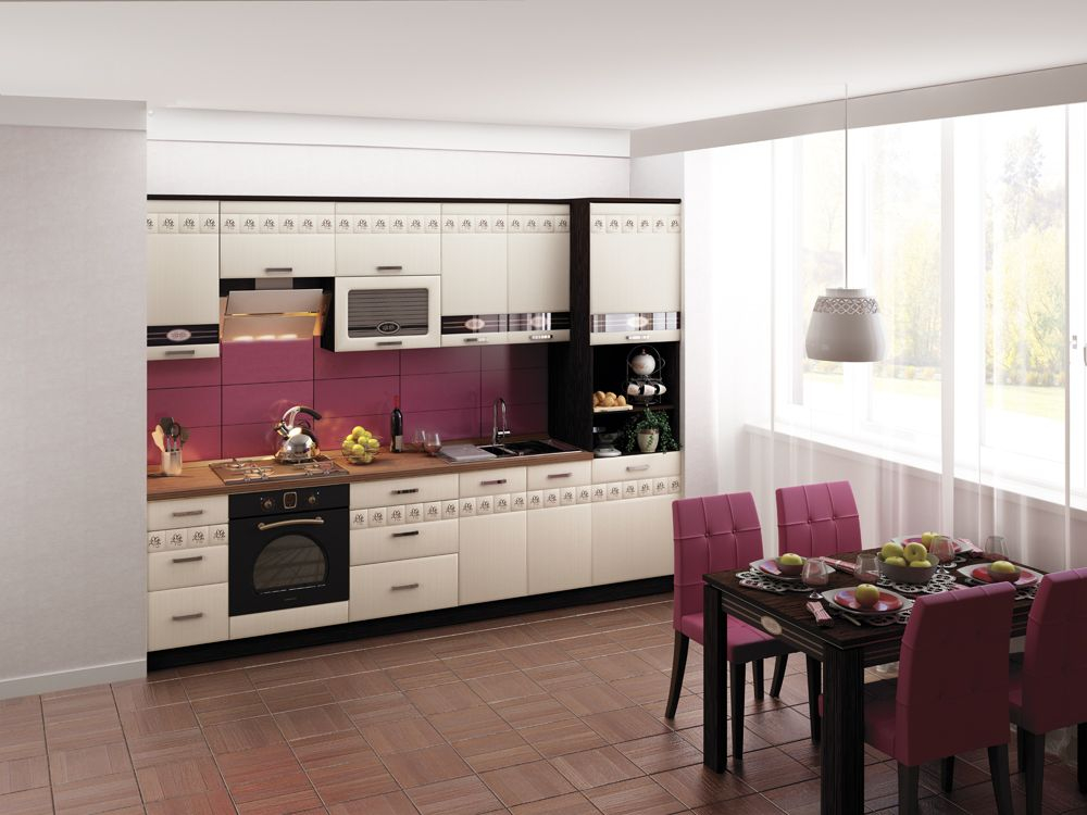 Детали корпуса кухонного набора выполнены из ЛДСП 16 и 22 мм с использованием кромки ПВХ 0.4 и 2.0 мм. Фасады выполнены из МДФ с глубокой фрезеровкой. Шкафы и столы соединяются между собой межсекционными стяжками. Все столы укомплектованы регулируемыми по высоте ножками и уплотнителем цоколя, который защищает стол от проникновения влаги. Столешница выполнена из постформинга толщиной 28 мм и укомплектована плинтусом. Выдвижные ящики столов укомплектованы метабоксами с дном из ЛДСП 16 мм. Декоративные элементы: комбинированные цвета стеклянная вставка с рисунком витражи фрезеровка с рисунком топ 22 мм металлический ограничитель на торцевом шкафу.