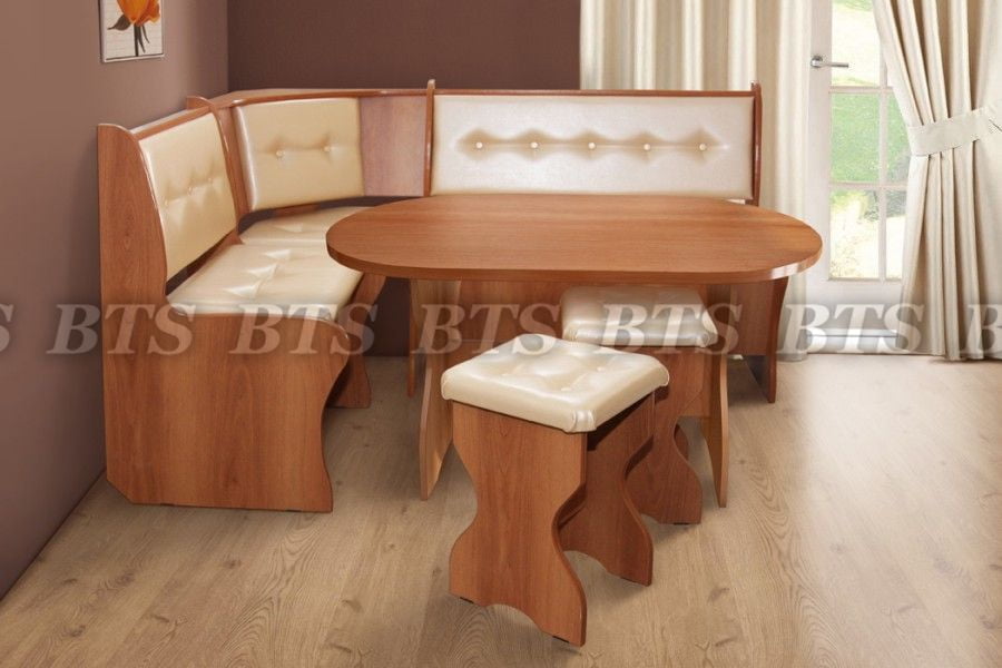 В комплект входит удобный угловой диванчик, два табурета и компактный, но довольно вместительный стол овальной формы (сложенный и разложенный вариант использования стола). Табуреты и диван имеют мягкую и удобную обивку. Такой вариант подходит как для большой семьи, так и для людей, любящих принимать много гостей. Кухонный угол Жасмин станет любимым местом сбора всей семьи и друзей.