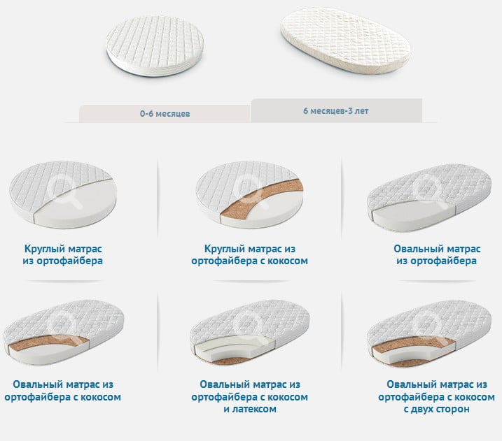Круглый матрас используется только в колыбельке. До 6 месяцев малышу рекомендуют спать только на твердой поверхности, поэтому матрас с кокосом с одной стороны подойдет лучше всего. Матрас предназначен для детей от рождения до 6-9 месяцев.