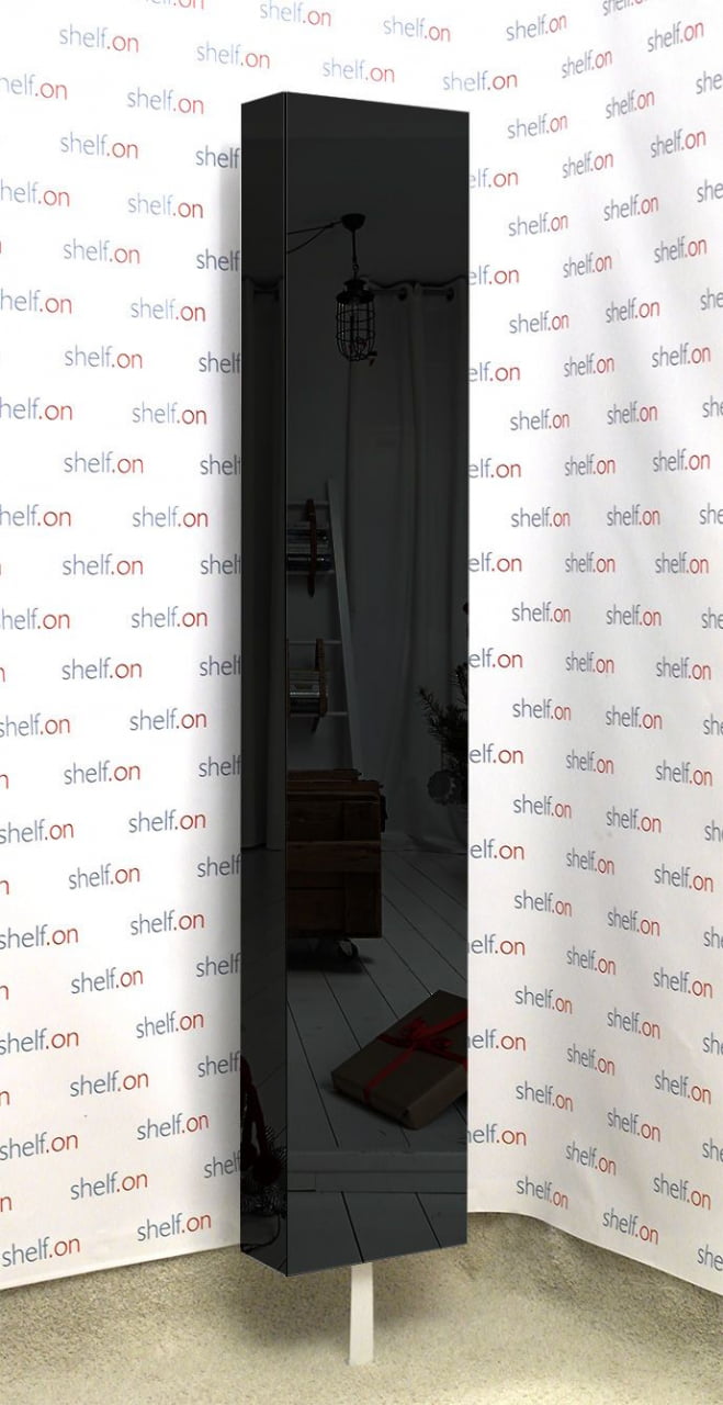 Корпус шкафа изготовлен из влагостойкого ЛДСП цвета венге или молочный дуб. С трех сторон шкафа - глянцевое черное стекло. Внутри - 6 широких полок. Поворачивается шкаф на 360°, скрывая полки. Поворотный шкаф крепится к стене на двух кронштейнах, нижний опирается на пол.