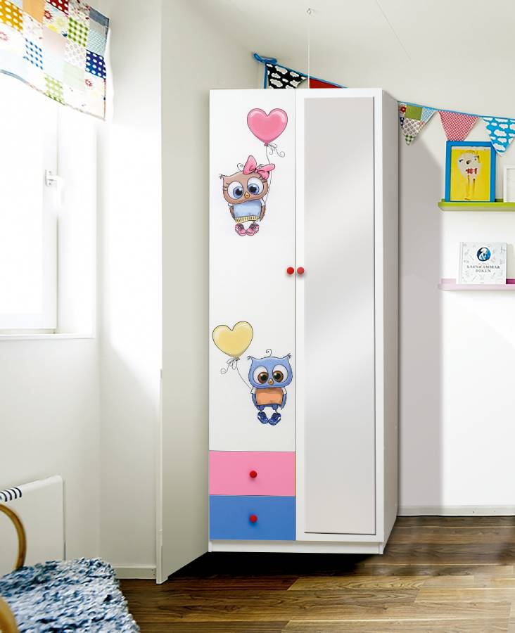 Шкаф 2-х дверный с ящиками, зеркалом и фотопечатью Совята 2.2 Белый/Ярко-розовый/Синий_204918