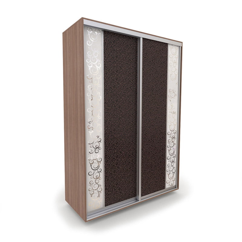 Двери купе выполнены в комбинации эко-кожи "Лоза" и зеркальной вставки с пескоструйной обработкой. Рисунок обработки "спирали", фон матовый, рисунок - зеркальный. Для темных тонов ЛДСП корпуса используется темный цвет эко-кожи, для светлых тонов – светлая. Высококачественный толстостенный алюминиевый профиль цвета хром матовый.