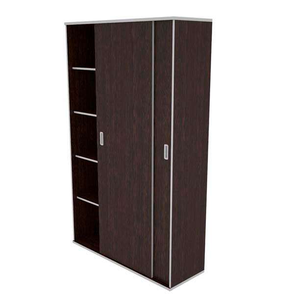 Шкаф-купе ЛШК-1представляет собой единую конструкцию, включающую в себя нижнее и верхнее основание, горизонтальные щиты, боковые стенки и задние стенки, две раздвижные двери с возможностью закрывания на замок и врезными ручками. Крышка, дно, бока изготавливаются из ЛДСП 22мм, остальные детали – ЛДСП 18мм. Устанавливается на регулируемые опоры М8. Наполнение - полки.