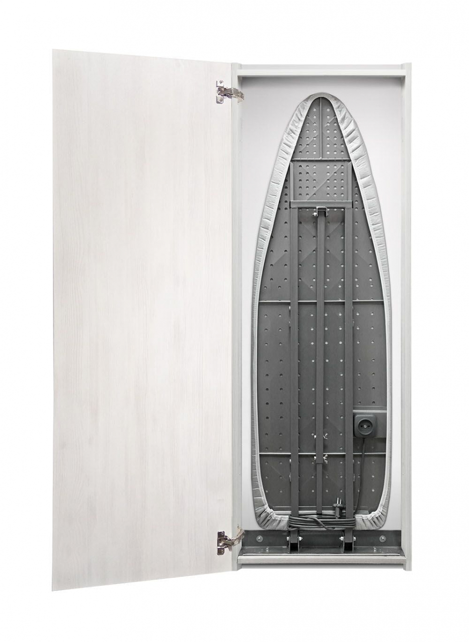 Широкая гладильная доска из перфорированного металла крепится к стене на мощном кронштейне. С другой стороны устойчивость придает нога, опирающаяся на пол под тупым углом. Благодаря регулировке опорной ноги доска может быть размещена на высоте от 75 до 95см от пола. Поднятая доска фиксируется к стене небольшим магнитом.