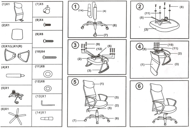 ВАЖНО: Все детали подробно перечислены в схеме-инструкции, которая также находится в коробке. Перед тем как собрать офисное кресло, обязательно проверьте, всё ли на месте – если чего-то не хватает, сразу несите покупку обратно в магазин. На этом же этапе убедитесь, что все комплектующие в порядке: ни царапин, ни потёртостей, ни других проблем.