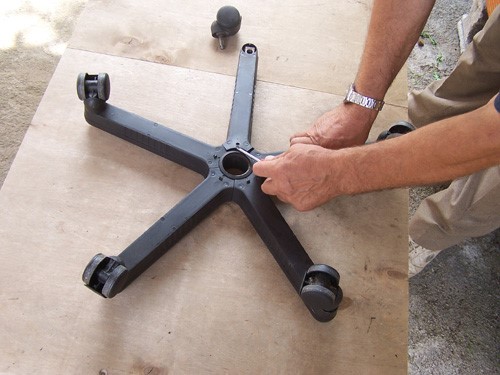 Как правило, собирать офисное кресло начинают снизу. Первый шаг – установка роликов в крестовину: