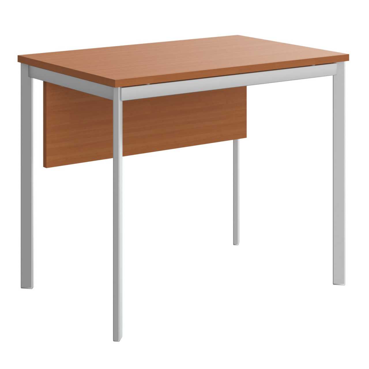 Столешница из ЛДСП т.22мм. Металлокаркас из трубы 40х20х1,5мм. без регулировки внизу. Опоры столов комплектуются пластиковой заглушкой. Покрытие краска белая полуматовая или алюминий. Металлокаркас соединяется со столешницей через металлическую проставку D-16мм. H-6мм. Комплектуется фронтальной панелью из ЛДСП т. 18мм. крепится к столешнице при помощи уголков.