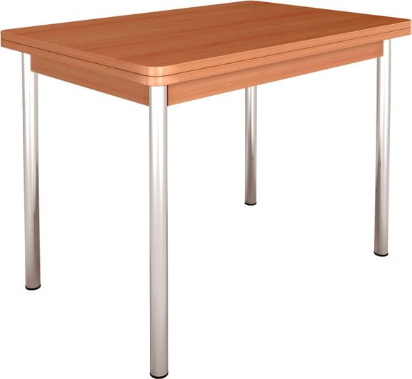 «Орфей 1.2» — обеденный стол с возможностью увеличения столешницы в 2 раза. Вместительную нишу для хранения кухонных мелочей оценит любая хозяйка, а металлические стоевые подчеркнут современный стиль обеденного стола.