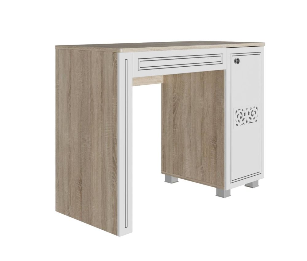 Стол туалетный состоит из закрытой тумбы с полкой справа и потайного отсека для хранения над местом для сидения, при открывании которого появляется возможность посмотреться в зеркало, расположенного на обратной стороне открывающейся крышки. Крышка открывается при помощи газ-лифта.