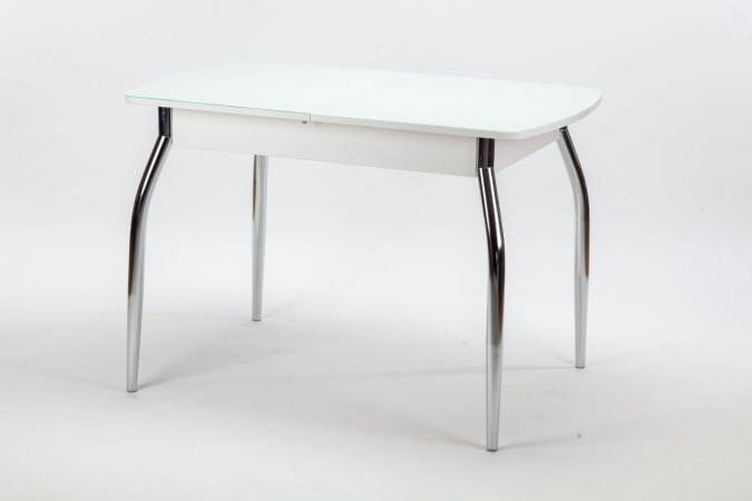 Механизм раскладки- синхронно -раздвижной (бабочка). В разложенном виде стеклянные половинки столешницы разделяет вставка из ДСП. Интересное сочетание в исполнение столешницы ДСП и закаленного стекла придаст шарм вашей кухне.