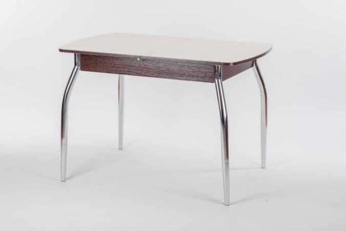 Механизм раскладки- синхронно -раздвижной (бабочка). В разложенном виде стеклянные половинки столешницы разделяет вставка из ДСП. Интересное сочетание в исполнение столешницы ДСП и закаленного стекла придаст шарм вашей кухне.