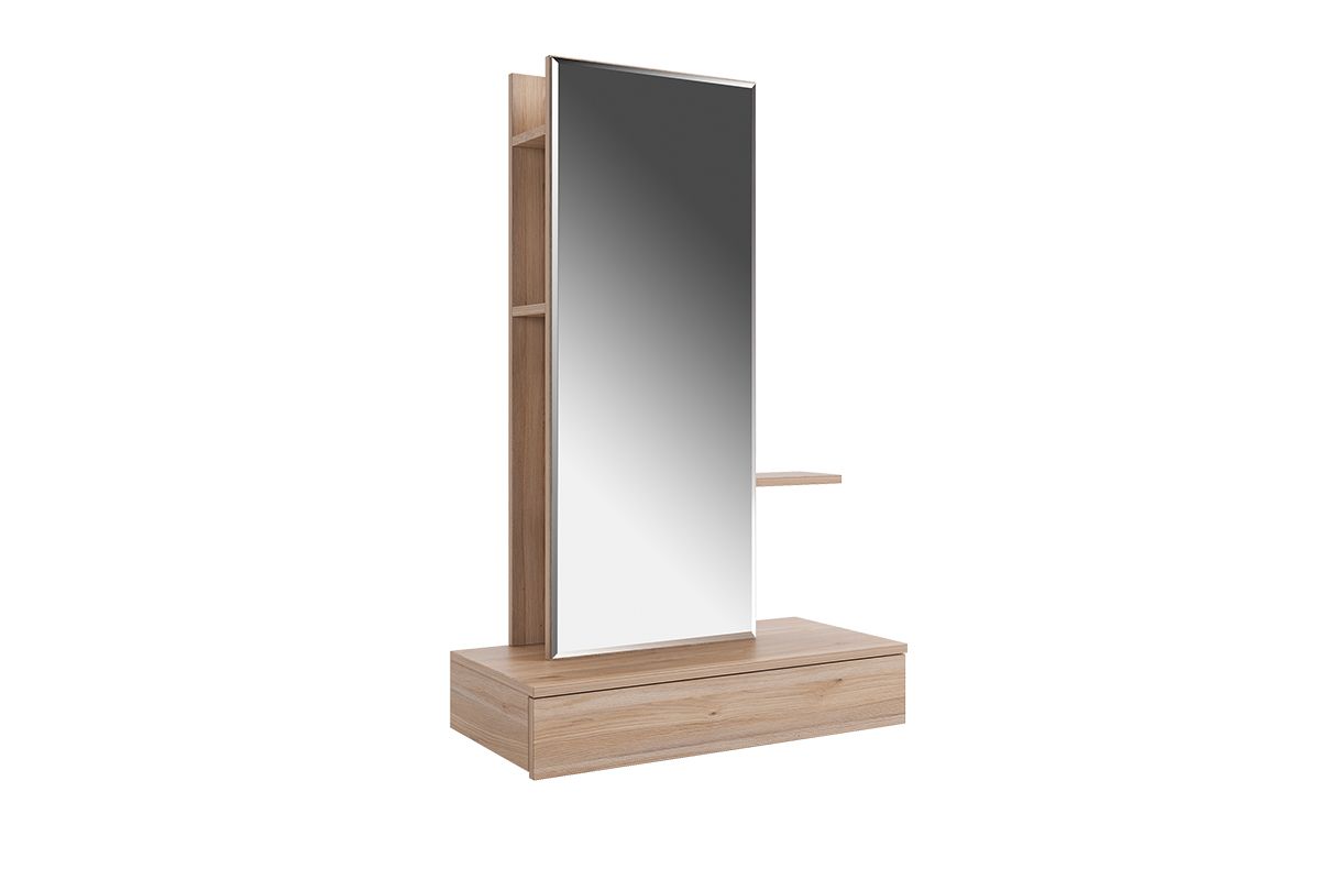 Сборка у трюмо универсальная. Зеркальную панель с полками можно установить ближе к левому либо ближе к правому краю. Так же полки за панелью крепятся в разных положениях.
