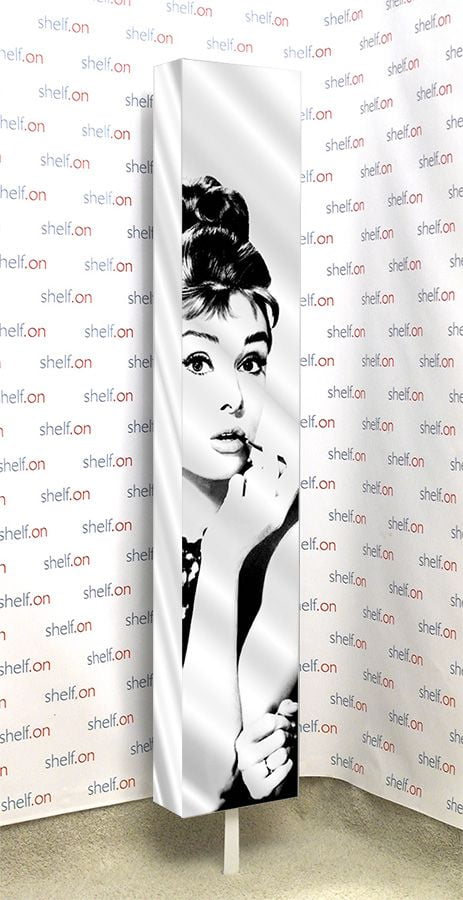 Поворотный шкаф Зум Шелф Арт с трех сторон оформлен зеркалами. На большое фасадное зеркало нанесено изображение.